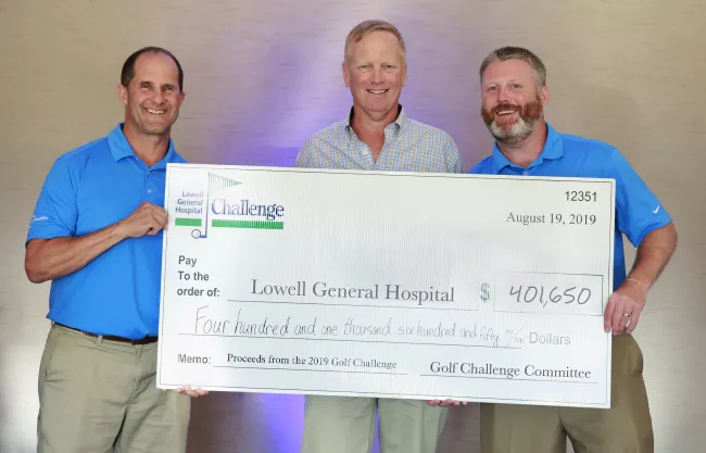 Other event highlights included the silent auction, hole-in-one and closest-to-the-pin competitions, a new chipping contest and the Trinity EMS Helicopter Ball Drop, a 50/50 raffle with quite the twist. Each entry is represented by a numbered golf ball that is sent up in a helicopter, which swoops down and drops the balls onto the 18th green. The ball that lands closest to the hole wins. This year, a record-breaking 725 balls were sold, raising $10,000. The lucky winner of the $5,000 prize was Steve Normandin of Chelmsford. Steve is heavily involved in the community and with the hospital, including serving as Chair of TeamWalk for CancerCare for several years.
