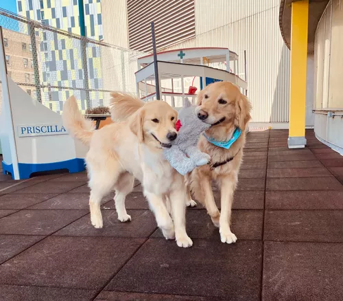 Both are hospital facility dogs who came to us through the generous support of Tufts Medical Center donors.