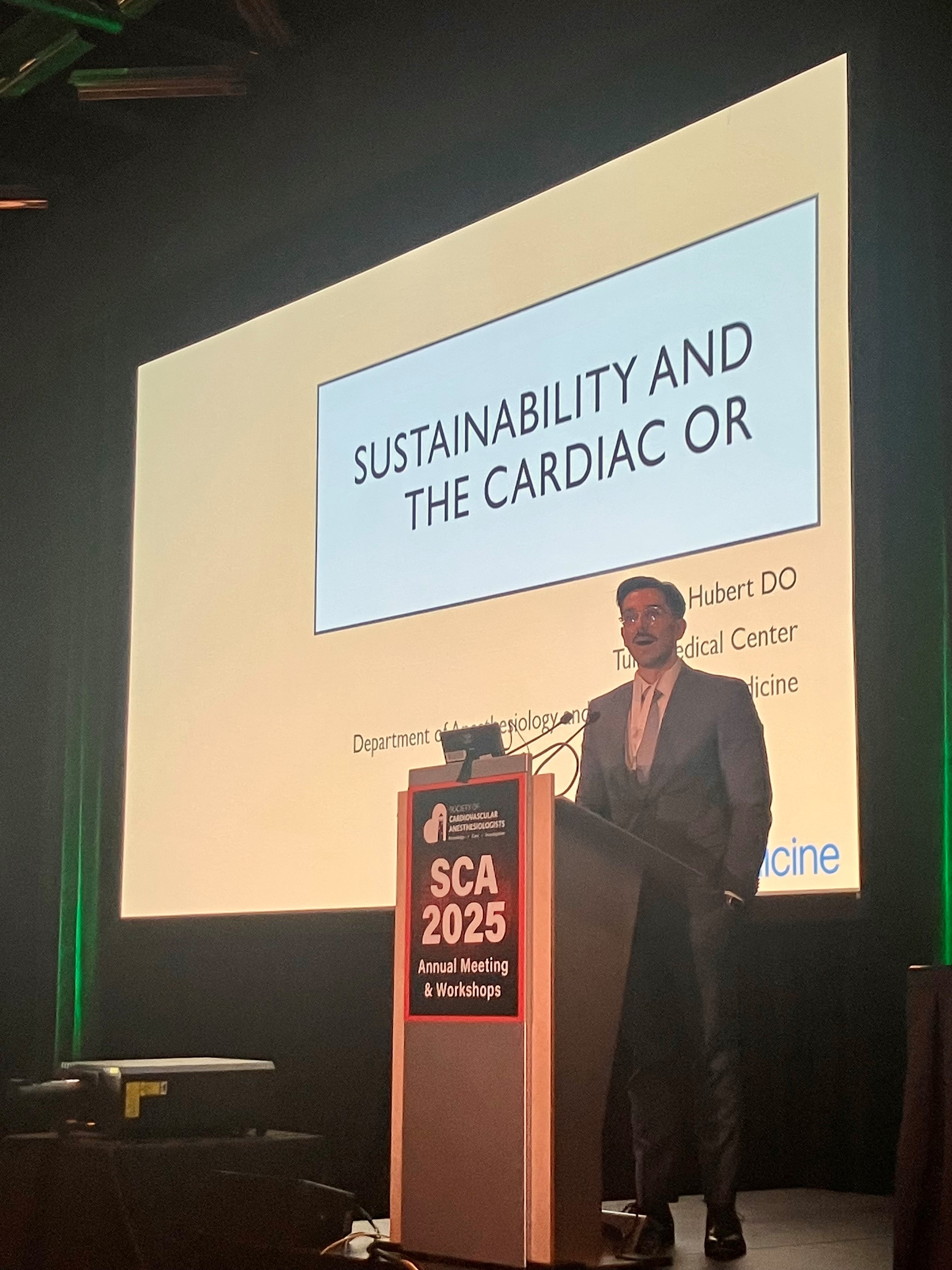 In the opening session, titled Sustainability in the Cardiac OR, Dr. Hubert contributed to the growing global discussion on healthcare’s carbon footprint, spotlighting the under-recognized role anesthesia plays in contributing to climate change.