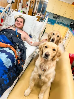 "Having a birthday in the hospital is certainly less than ideal," says Hunter, while celebrating his nineteenth birthday in the CSICU, "but I got to say, these dogs have helped me through everything so much and made my bad days so much better."