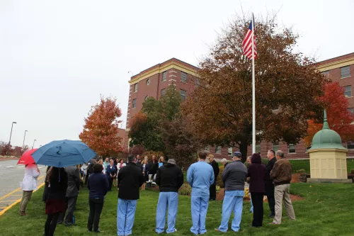 The ceremony included raising the American Flag, the singing of the National Anthem by Paul Beausoleil, Copy Center Coordinator, and remarks by Deb Bergholm-Petka, Director of Organizational Development, Sabrina Granville, Senior Vice President and Chief Human Resources Officer, and Cece Lynch, Vice President of Patient Care Services and Chief Nurse Executive.