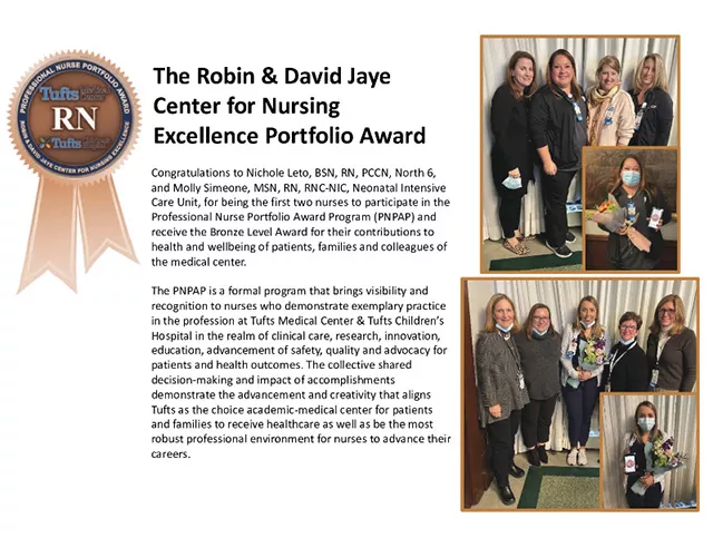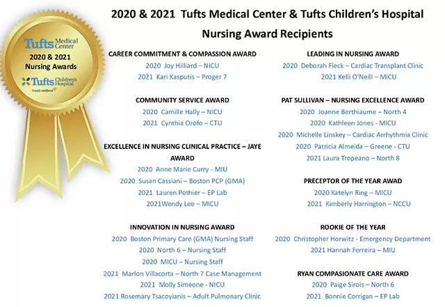 During Nurses Week each year, Tufts Medical Center honors excellence in nursing with an awards ceremony and reception. Nurses are nominated by their peers, leadership and patients, with a committee choosing the recipients. We are fortunate to have generous donors who sponsor two very special awards: The Ryan Compassionate Care Award and the Edward and Sylvia Jaye Excellence in Nursing Clinical Practice Award.