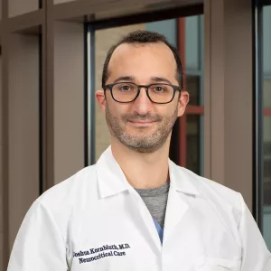 David Thaler, MD, PhD, FAHA, Neurologist-in-Chief at Tufts Medical Center, proudly displays the department's art exhibit, Neurology, Illustrated, complete with pieces that provide insight into neurology in society.