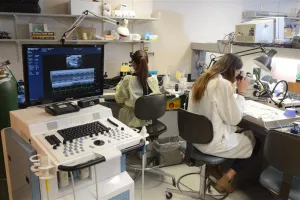The fourth room houses a VisualSonics ultrasound machine with an associated tabletop gas anesthesia machine, a heated platform with EKG and a micromanipulator for injections. This area contains two separate anesthesia platforms to enable echocardiography on either mice or rats. The room also houses a Dexa imager capable of measuring bone density and body composition of mice.