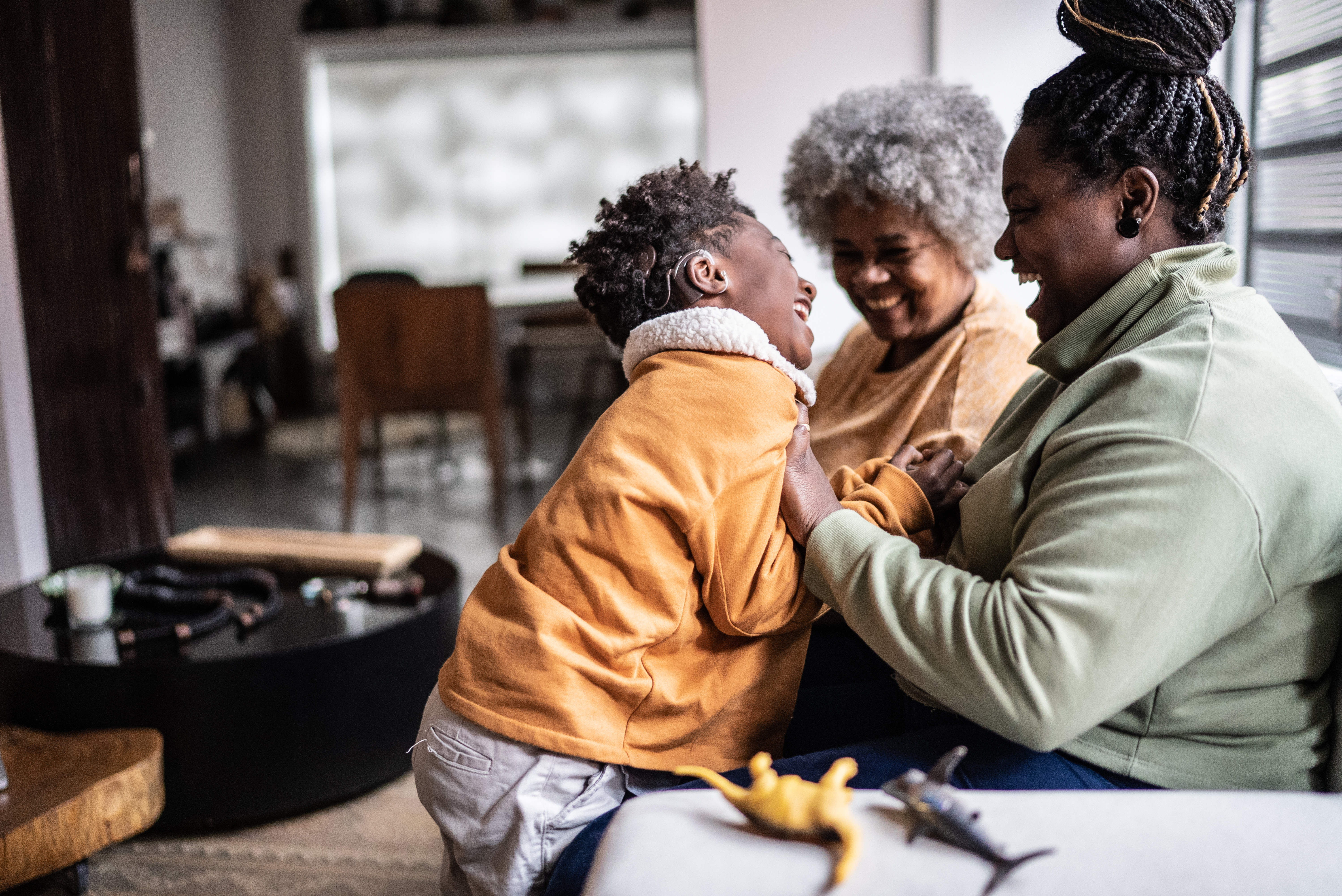 Child, with an implantable hearing device, playing with his mother and grandmother in the living room at home.