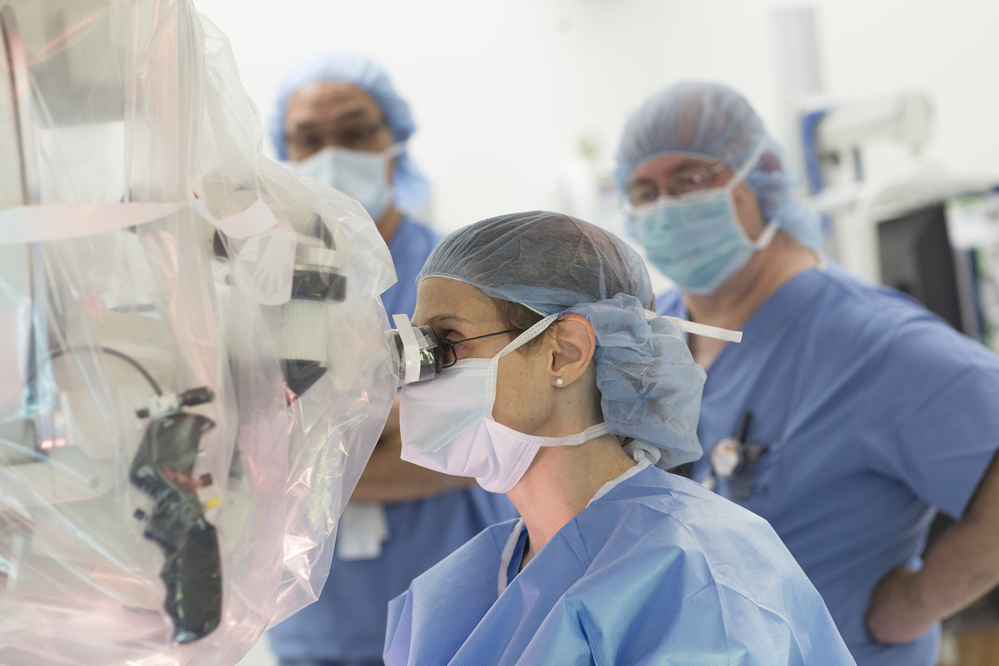 Otolaryngologist Miriam, O'Leary, MD, FACS in an ENT surgery at Tufts Medical Center looking through machine.